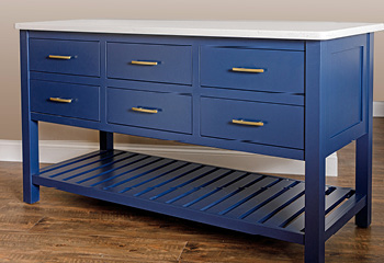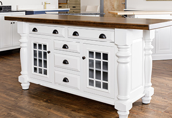 Our kitchen islands feature solid wood fronts, drawers, drawer boxes, panel ends, and door.