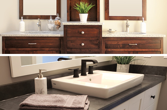 We offer the latest styles of vanity tops. Choose from quartz, granite, solid hardwoods and more. Tops are available with a backsplash, sidesplash and sink options.